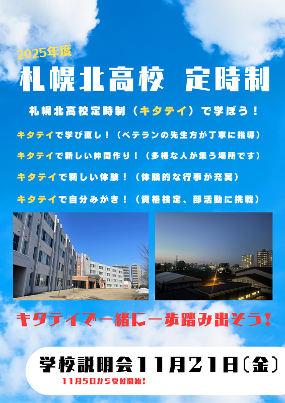 北海道札幌北高等学校定時制課程では、働きながら学びたい人や不登校を経験した人、学び直しの人も高校卒業をめざし勉強や部活動に励み、充実した高校生活を送っています。